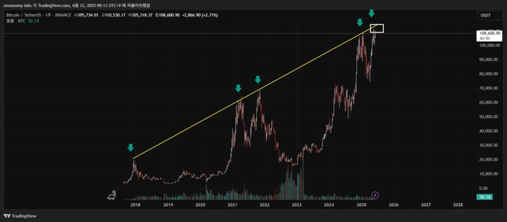 비트코인 주봉 차트입니다. 2018년부터 2025년 현재까지 긴 추세선이 보이며 저항을 여러번 받은 것이 보입니다. 지금 비트코인이 저항을 받는 구간대는 110K인데 이 110K를 뚫어주면 또 다른 상승장이 오면서 여태까지 저항 받았던 추세선은 허물어지는 과정을 겪을 것입니다.