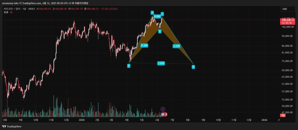 일봉 차트입니다. 일봉 차트를 보면 110K에서 저항을 맞고 108K까지 떨어진 모습이 보입니다. 이론적으로 안 맞지만, 불규칙적인 하모닉 혹은 사이퍼 패턴이 형성 될 가능성이 있어 보입니다.