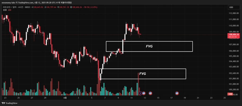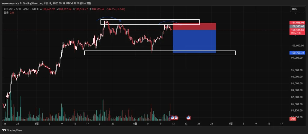 타겟가는 대략 2차 FVG 부근인 100K~102K를 놓고 숏으로 장기 스윙 전략을 취하는 것이 메리트 있어 보입니다. 1차 수익실현은 대략 105~106K에서 하고 나머지는 들고 가는 전략을 취하는 것이 현명하다고 봅니다.