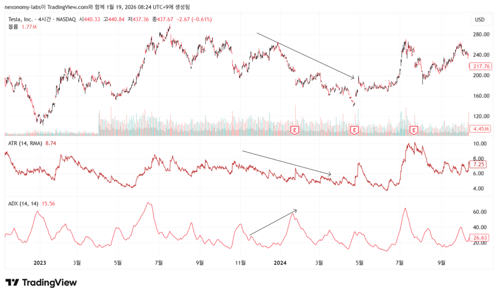 ATR와 ADX의 차이점은 그렇다면 무엇일까요? 그렇습니다. 바로 변동성과 강도의 차이입니다. 변동성이 아무리 크다고 해서 강도가 크게 오름세를 보일 것이라는 것은 착각입니다. 위 사진을 보면 테슬라 4시간봉 차트인데 2024년 말쯤 하락세를 보이는 주가의 ADX는 오름세를 보였지만, ATR는 낮은 수치를 보였습니다.