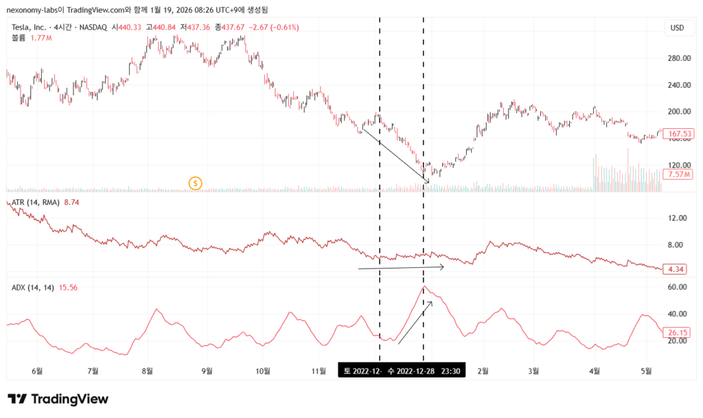 2022년도 마찬가지입니다. 2022년도 12월 말쯤 테슬라 주가는 하락세를 보이며 ADX가 동시에 오름세를 보였습니다. 하지만, ATR는 바닥을 다지고 있었습니다.