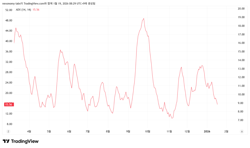 이번에는 ADX에 대해서 알아보도록 하겠습니다. ADX는 Average Directional Index라는 것을 뜻합니다. 이 지표는 추세의 방향성의 강도를 나타내는 지표이며 얼마나 추세가 강한 지를 알려줍니다. 수치가 낮을 수록 추세는 약하다는 것을 보이며 수치가 높을 수록 추세가 강하다는 것을 나타내죠. 주로 추세 강도 기준선은 25 수치를 기준으로 나타냅니다.