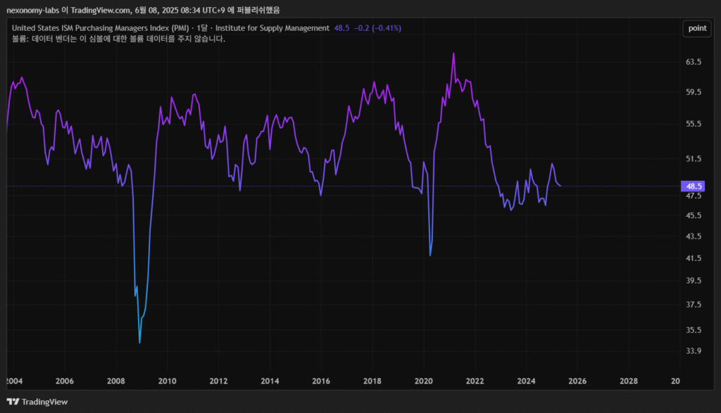 PMI를 해석 할 때 수치로만 보는 방법만 하기는 아쉽습니다. 추세와 위치를 파악하고 추세가 50선을 과하게 넘을 경우 과열 50선을 밑으로 과하게 하락할 경우 침체를 뜻한다고 해석하면 좋습니다. 또한 해당 위치에 따라 사이클로 판단하는 것도 좋은 해석 방법입니다. 예를 들어 과열 된 수치로 80의 수치가 나올 경우 연준의 경기 과열 조절이 올 수 있겠구나 판단하는 것처럼 하는 방법입니다.